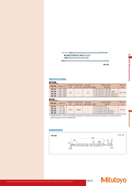 140-158InsideMicrometersSPECIFICATIONSMetricCodeNo.Range(mm)1000-20001000-30001000-40001000-5000140-157140-158140-159140-160InchCodeNo.Range(in)140-161140-162140-163140-16440-8040-12040-16040-200Graduation(mm)Spindlefeederror*(µm)Micrometerheadstroke(mm)QtyExtensionpipesSize(mm)0.01650567850,100(2pcs.),200,50050,100(2pcs.),200,500,100050,100(2pcs.),200,500,1000(2pcs.)50,100(2pcs.),200,500,1000(3pcs.)Graduation(in)Spindlefeederror*(in)Micrometerheadstroke(in)QtyExtensionpipesSize(in)0.0010.0003256782,4(2pcs.),8,202,4(2pcs.),8,20,402,4(2pcs.),8,20,40(2pcs.)2,4(2pcs.),8,20,40(3pcs.)Mainunit(mm)1000-1050Mainunit(in)40-42*"Spindlefeederror”referstothedifferencebetweenthemaximumandminimumindicationerrorvalueswithinthemeasuringrangeofthemicrometerheadUnit:mmSR1015ø8ø21833ø33ø322950ø3320016.55ø8SR10DIMENSIONS140-15808-24
