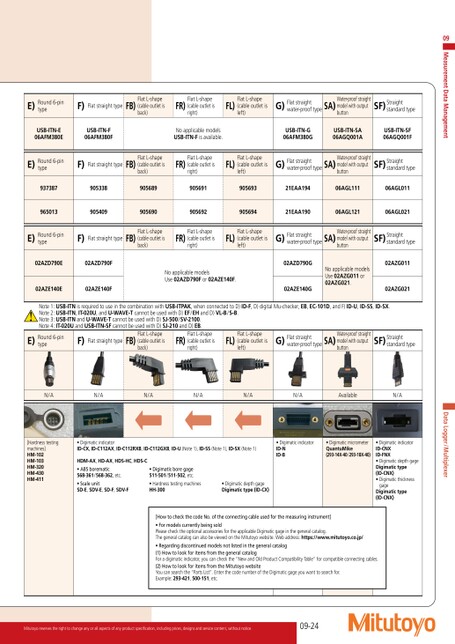 E)Round6-pintypeF)FlatstraighttypeFB)FlatL-shape(cableoutletisback)FR)FlatL-shape(cableoutletisright)FL)FlatL-shape(cableoutletisleft)G)Flatstraightwater-prooftypeSA)Water-proofstraightmodelwithoutputbuttonSF)StraightstandardtypeUSB-ITN-E06AFM380EUSB-ITN-F06AFM380FNoapplicablemodelsUSB-ITN-Fisavailable.USB-ITN-G06AFM380GUSB-ITN-SA06AGQ001AUSB-ITN-SF06AGQ001FE)Round6-pintypeF)FlatstraighttypeFB)FlatL-shape(cableoutletisback)FR)FlatL-shape(cableoutletisright)FL)FlatL-shape(cableoutletisleft)G)Flatstraightwater-prooftypeSA)Water-proofstraightmodelwithoutputbuttonSF)Straightstandardtype93738790533890568990569190569321EAA19406AGL11106AGL01196501390540990569090569290569421EAA19006AGL12106AGL021E)Round6-pintypeF)FlatstraighttypeFB)FlatL-shape(cableoutletisback)FR)FlatL-shape(cableoutletisright)FL)FlatL-shape(cableoutletisleft)G)Flatstraightwater-prooftypeSA)Water-proofstraightmodelwithoutputbuttonSF)Straightstandardtype02AZD790E02AZD790F02AZE140E02AZE140FNoapplicablemodelsUse02AZD790For02AZE140F.02AZD790G02AZE140GNoapplicablemodelsUse02AZG011or02AZG021.02AZG01102AZG021Note1:USB-ITNisrequiredtouseinthecombinationwithUSB-ITPAK,whenconnectedtoD)ID-F,D)digitalMu-checker,EB,EC-101D,andF)ID-U,ID-SS,ID-SX.Note2:USB-ITN,IT-020U,andU-WAVE-TcannotbeusedwithD)EF/EHandD)VL-B/S-B.Note3:USB-ITNandU-WAVE-TcannotbeusedwithD)SJ-500/SV-2100.Note4:IT-020UandUSB-ITN-SFcannotbeusedwithD)SJ-210andD)EB.E)Round6-pintypeF)FlatstraighttypeFB)FlatL-shape(cableoutletisback)FR)FlatL-shape(cableoutletisright)FL)FlatL-shape(cableoutletisleft)G)Flatstraightwater-prooftypeSA)Water-proofstraightmodelwithoutputbuttonSF)StraightstandardtypeN/AN/AN/AN/AN/AN/AAvailableN/ADataLogger/Multiplexer[Hardnesstestingmachines]HM-102HM-103HM-320HM-430HM-411•DigimaticindicatorID-CX,ID-C112AX,ID-C112RXB,ID-C112GXB,ID-U(Note1),ID-SS(Note1),ID-SX(Note1)HDM-AX,HD-AX,HDS-HC,HDS-C•ABSborematic568-361/568-362,etc.•ScaleunitSD-E,SDV-E,SD-F,SDV-F•Digimaticboregage511-501/511-502,etc.•HardnesstestingmachinesHH-300•DigimaticdepthgageDigimatictype(ID-CX)•DigimaticindicatorID-NID-B•DigimaticmicrometerQuantuMike(293-14X-40/293-18X-40)•DigimaticindicatorID-CNXID-FNX•DigimaticdepthgageDigimatictype(ID-CNX)•DigimaticthicknessgageDigimatictype(ID-CNX)[HowtocheckthecodeNo.oftheconnectingcableusedforthemeasuringinstrument]•FormodelscurrentlybeingsoldPleasechecktheoptionalaccessoriesfortheapplicableDigimaticgageinthegeneralcatalog.ThegeneralcatalogcanalsobeviewedontheMitutoyowebsite.Webaddress:https://www.mitutoyo.co.jp/•Regardingdiscontinuedmodelsnotlistedinthegeneralcatalog(1)HowtolookforitemsfromthegeneralcatalogForadigimaticindicator,youcancheckthe“NewandOldProductCompatibilityTable”forcompatibleconnectingcables.(2)HowtolookforitemsfromtheMitutoyowebsiteYoucansearchthe“PartsList”.EnterthecodenumberoftheDigimaticgageyouwanttosearchfor.Example:293-421,500-151,etc.09-24