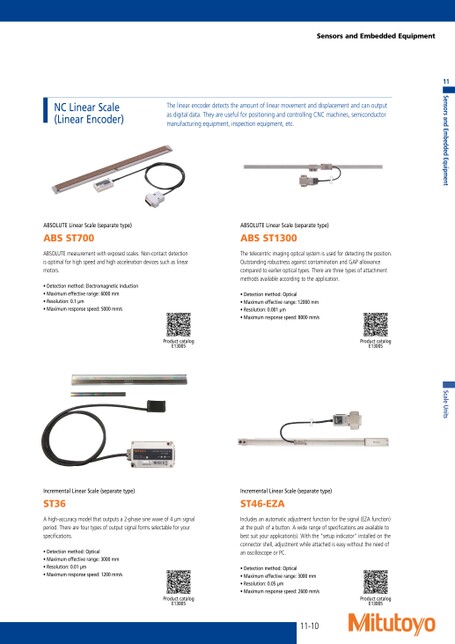 ScaleUnitsNCLinearScale(LinearEncoder)Thelinearencoderdetectstheamountoflinearmovementanddisplacementandcanoutputasdigitaldata.TheyareusefulforpositioningandcontrollingCNCmachines,semiconductormanufacturingequipment,inspectionequipment,etc.ABSOLUTELinearScale(separatetype)ABSST700ABSOLUTEmeasurementwithexposedscales.Non-contactdetectionisoptimalforhighspeedandhighaccelerationdevicessuchaslinearmotors.•Detectionmethod:Electromagneticinduction•Maximumeffectiverange:6000mm•Resolution:0.1µm•Maximumresponsespeed:5000mm/sABSOLUTELinearScale(separatetype)ABSST1300Thetelecentricimagingopticalsystemisusedfordetectingtheposition.OutstandingrobustnessagainstcontaminationandGAPallowancecomparedtoearlieropticaltypes.Therearethreetypesofattachmentmethodsavailableaccordingtotheapplication.•Detectionmethod:Optical•Maximumeffectiverange:12000mm•Resolution:0.001µm•Maximumresponsespeed:8000mm/sProductcatalogE13005ProductcatalogE13005IncrementalLinearScale(separatetype)IncrementalLinearScale(separatetype)ST36ST46-EZAAhigh-accuracymodelthatoutputsa2-phasesinewaveof4µmsignalperiod.Therearefourtypesofoutputsignalformsselectableforyourspecifications.•Detectionmethod:Optical•Maximumeffectiverange:3000mm•Resolution:0.01µm•Maximumresponsespeed:1200mm/sIncludesanautomaticadjustmentfunctionforthesignal(EZAfunction)atthepushofabutton.Awiderangeofspecificationsareavailabletobestsuityourapplication(s).Withthe"setupindicator"installedontheconnectorshell,adjustmentwhileattachediseasywithouttheneedofanoscilloscopeorPC.•Detectionmethod:Optical•Maximumeffectiverange:3000mm•Resolution:0.05µm•Maximumresponsespeed:2600mm/sProductcatalogE13005ProductcatalogE1300511-10
